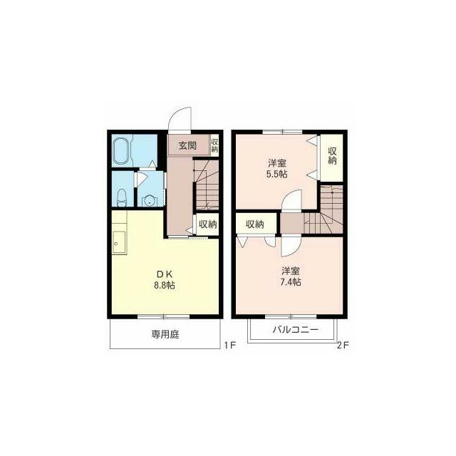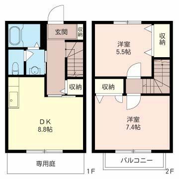 | 間取り | 2DK(DK8.8帖 洋室5.5帖 洋室7.4帖) | 主要採光面 | 南 |